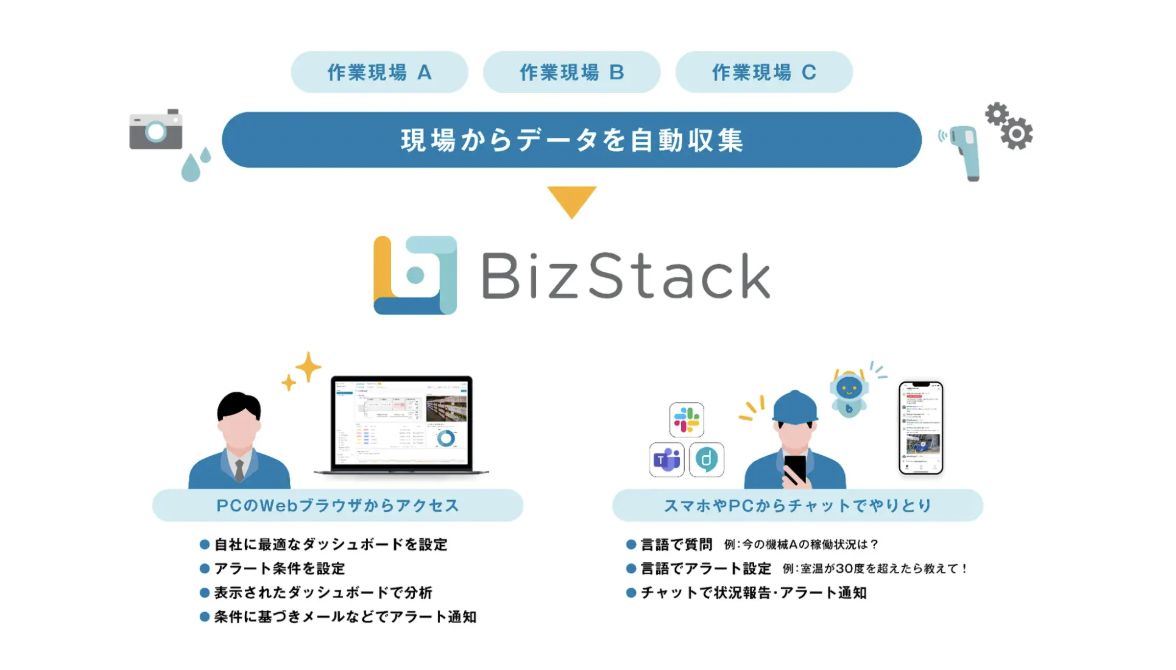 BizStackは現場の今をAIが理解し対話形式で業務をサポートする現場特化型のAIアプリケーションである。