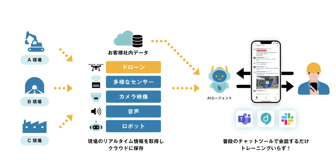 建設・製造・物流などの人手不足や属人化といった課題を抱える現場において、センサーやカメラなどから取得されるリアルタイムデータをもとに生成AIが自然言語で状況を報告し作業判断を支援する。