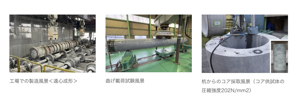 現在、既製杭に用いられるコンクリートの最高強度は140N/mm2(同社調べ)とされているが、同社はこうした市場のニーズに応えるべく、コンクリート強度200N/mm2級の実物大コンクリートパイルを遠心成形で製造することに成功した。