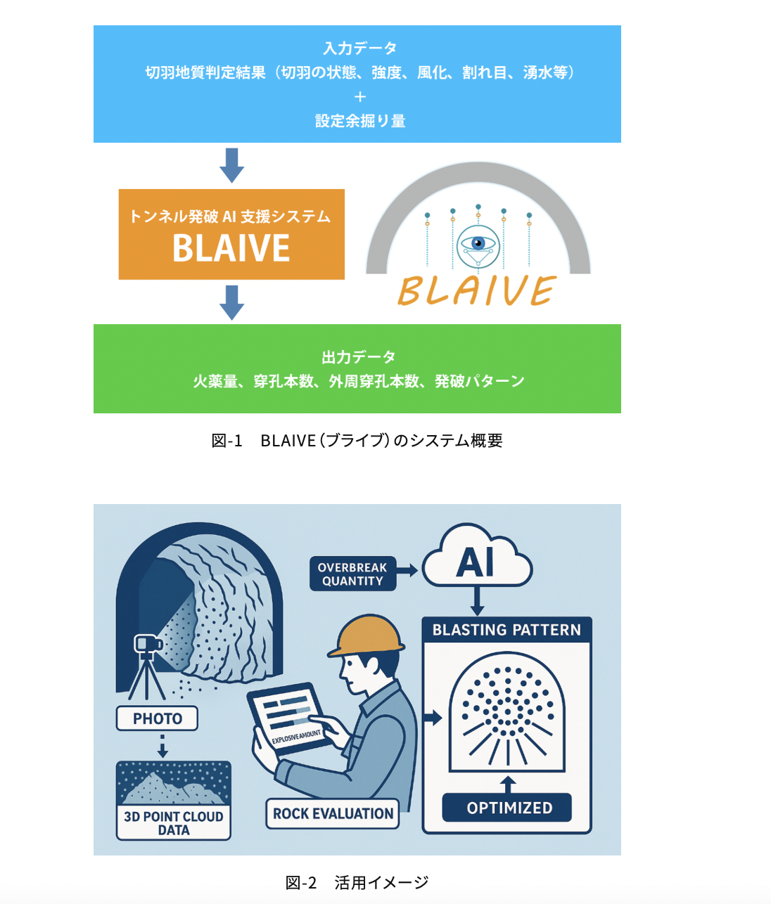 熊谷組は、トンネル発破工事において、AI技術を活用して切羽観察から最適な発破パターンを導き出し、見える化する次世代支援システム「BLAIVE(ブライブ)」を開発した。