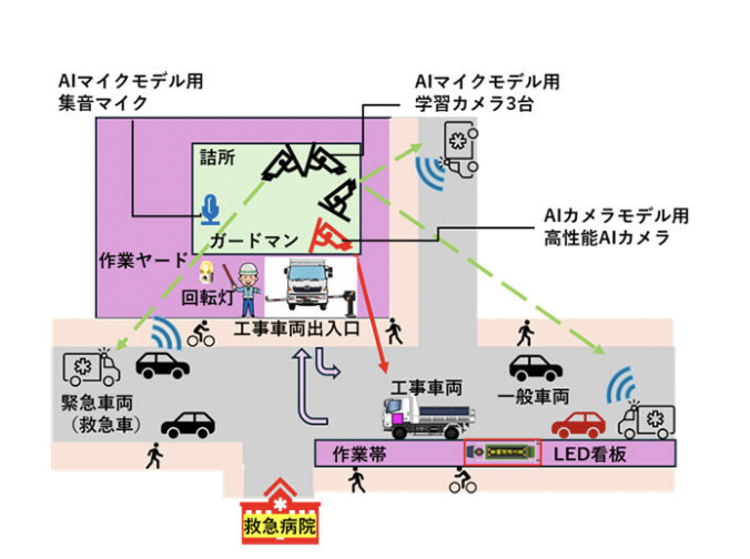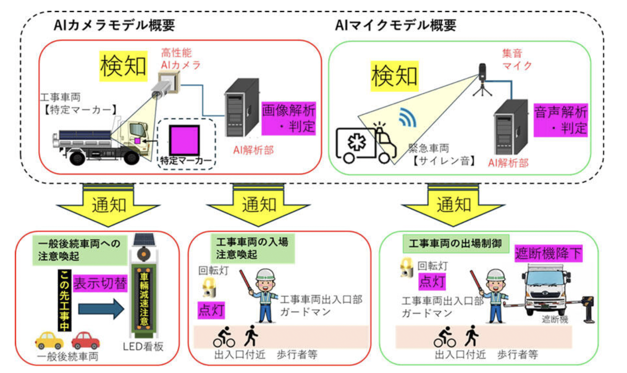 本システムは、道路を走行する全ての車両の中から工事車両のみを識別する「AIカメラモデル」と、救急車などのサイレン音を検知する「AIマイクモデル」で構成される。