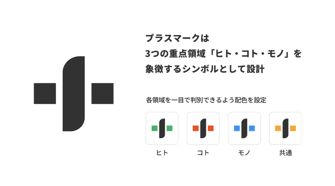 新しいロゴの中心となるプラスマークは「ヒト・コト・モノ」の3つの領域を象徴するシンボルとして設計され、各領域を視覚的に表すため意図的に3つのパーツで構成。