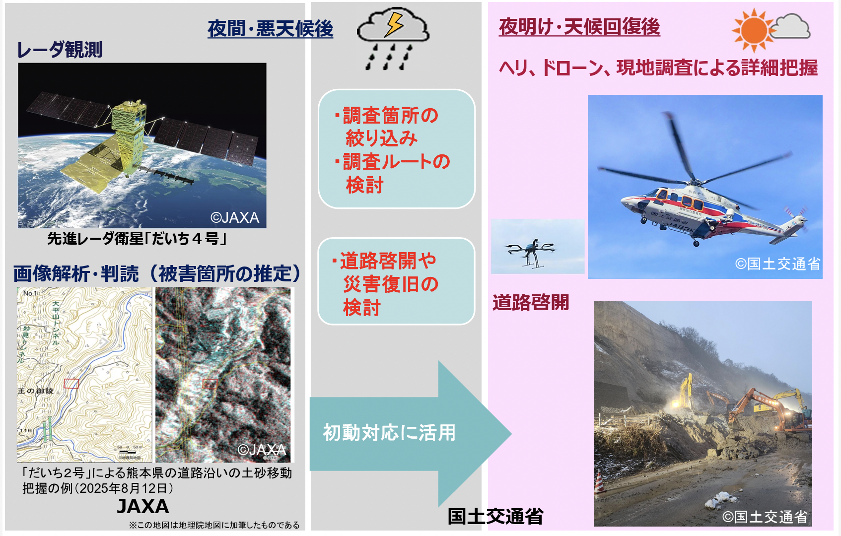 だいち2号による熊本県の道路沿いの土砂移動把握の例では、2025年8月12日の観測で被害状況が効率的に把握された実績がある。