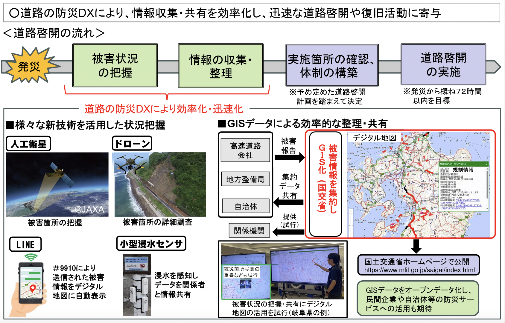 道路の防災DXにより、情報収集・共有を効率化し、迅速な道路啓開や復旧活動に寄与する取り組みも進められている。様々な新技術を活用した状況把握として、人工衛星、ドローン、小型浸水センサなどが活用され、GISデータによる効率的な整理・共有が行われる。