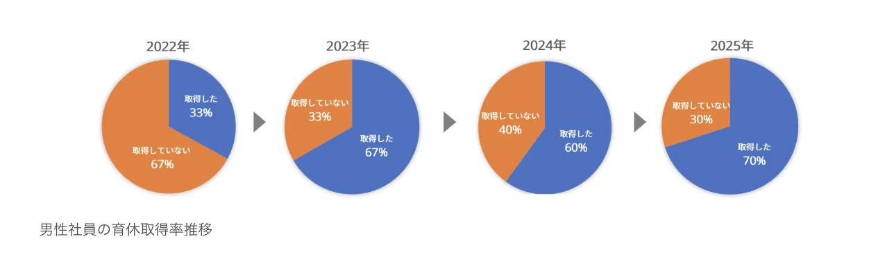 男性社員の育休取得率は、2022年33%(対象3名中1名)、2023年66.7%(対象3名中2名)、2024年60%(対象5名中3名)、2025年70%(対象10名中7名)と推移。