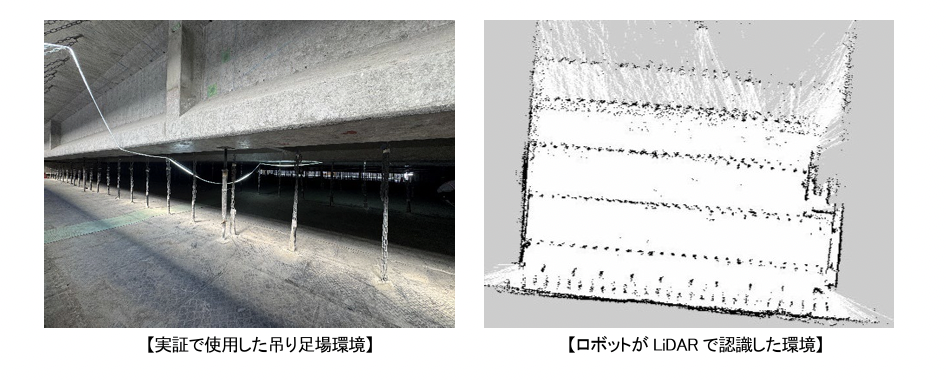 吊り足場全般の特徴として、一枚の大きな床材ではなく細かい床材の集合であるため軽微な段差が多く存在すること、また床材と構造物を繋ぐチェーンやワイヤーなど、LiDARで検知しにくい障害物があることが課題だった。