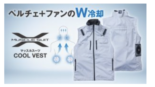 マッスルスーツ COOL VESTは、首元に配置したペルチェデバイスによる直接的な冷却と、ファンによる送風の二重構造により、従来の冷却グッズの課題を克服した。電源には、気温変化に強く安全性の高いリン酸鉄モバイルバッテリー20,000mAhを採用している。