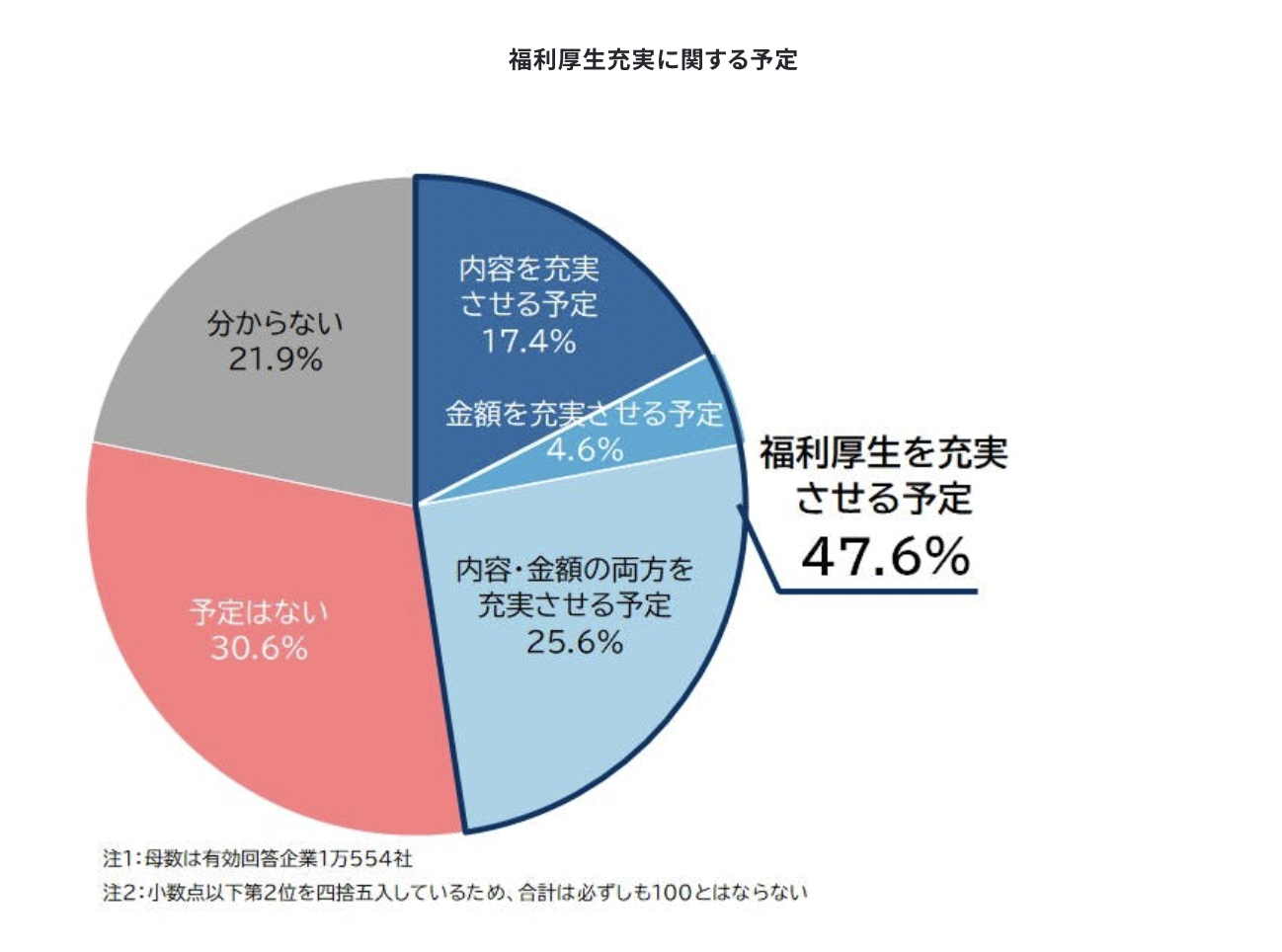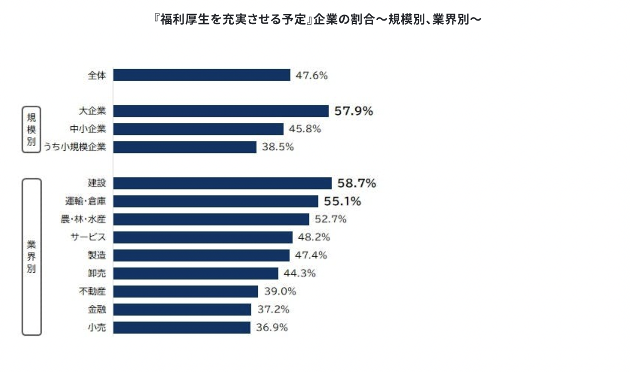 今後、法定福利を除く福利厚生を充実させる予定があるか尋ねたところ、全体では福利厚生を充実させる予定の企業は47.6%と5割近くにのぼった。