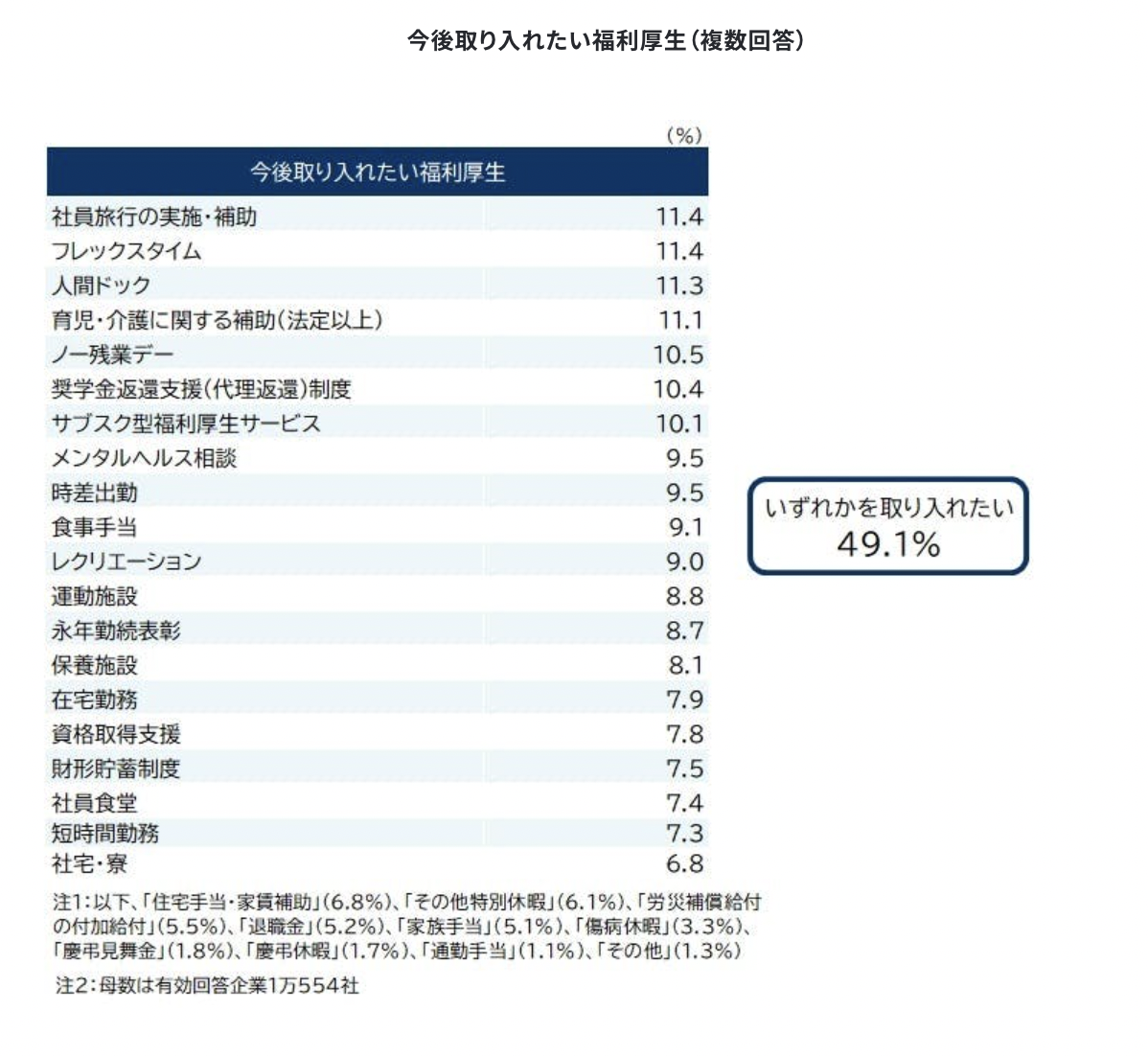 今後取り入れたい法定福利を除く福利厚生を尋ねたところ、社員旅行の実施・補助およびフレックスタイムがいずれも11.4%でトップとなった。