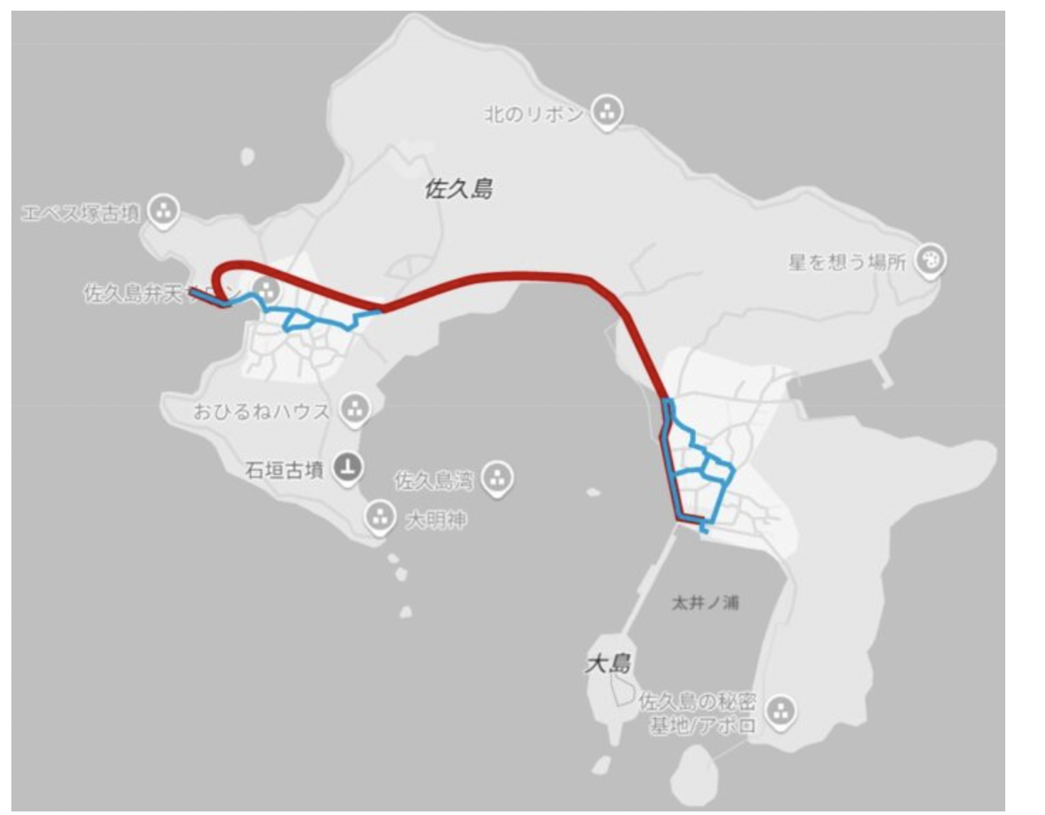 〈赤:自動運転車、青:自動配送ロボット(東・西地区)〉本年度の新たな試みとして、ドローン連動型信号機システムを島内に設置した。