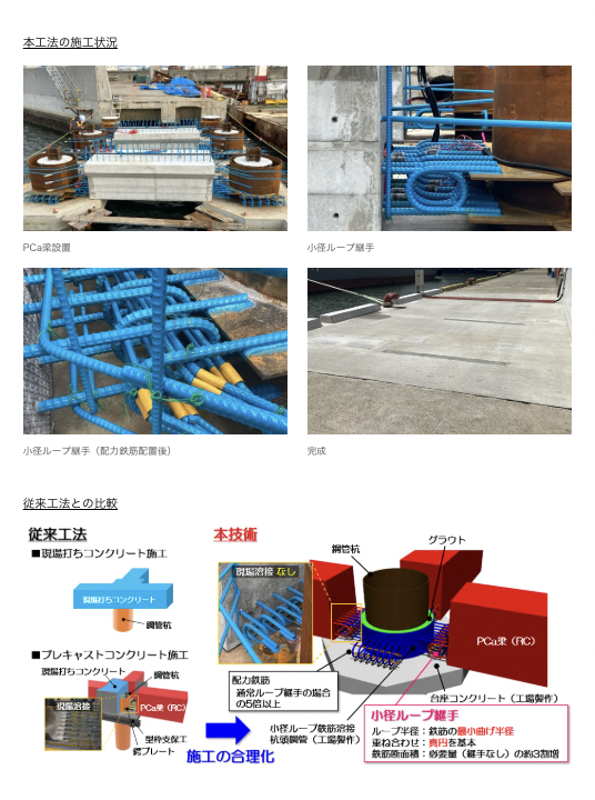 桟橋上部工に適用した場合、現場打ち工法と比較して海上施工の工期を約50パーセント、作業員数を約75パーセント削減できることが同社施工実績に基づく試算で確認されている。