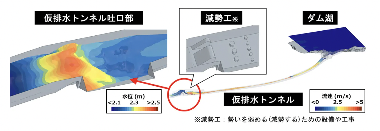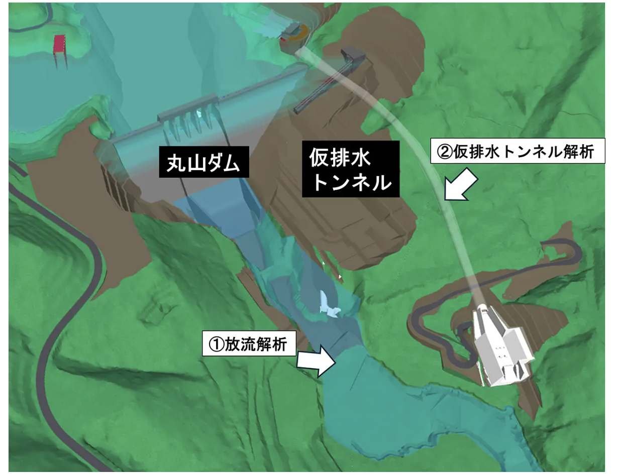 今回の取り組みでは最新の現地状況を再現したBIM/CIMデータを基盤に解析用モデルを作成した後、3次元流体解析を実施し、既存ダムからの放流や新設ダムの仮排水トンネルからの放流状況を高精度にデジタルツイン化することで設計・施工方法を検討した。