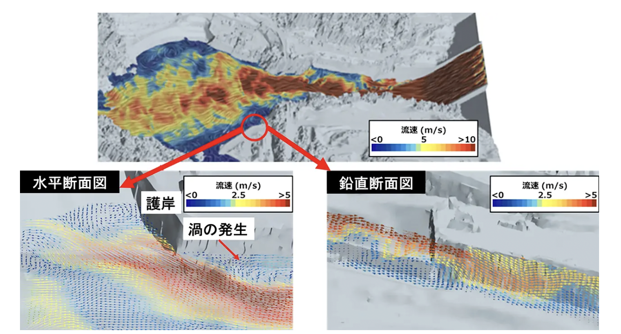 従来は困難であった任意点に着目した流れの内部状況を容易に把握できるため、水位や流速などを詳細に分析できるようになり、現場ごとの構造検討や施工計画に迅速に対応できるようになる。
