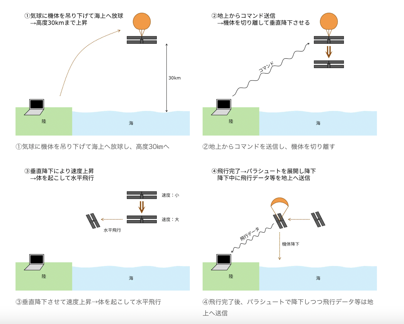 高高度での飛行実験は、気球で高度30kmまで上昇し、高度30kmで実験機を放出、実験機を滑空させ飛行データを取得し、パラシュートを展開し安全に落下、地上で実験機を回収という流れで行われる。