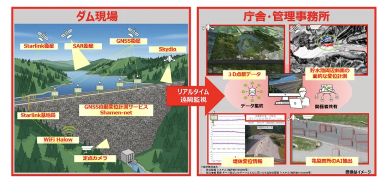 今後3社は、本実証で確立したダム管理DX手法に地上からのセンシングとして監視カメラ、宇宙からのセンシングとしてSAR衛星(合成開口レーダ)を加えた次世代通信を活用したインフラモニタリングサービスをパッケージ化して、社会実装を加速させる。