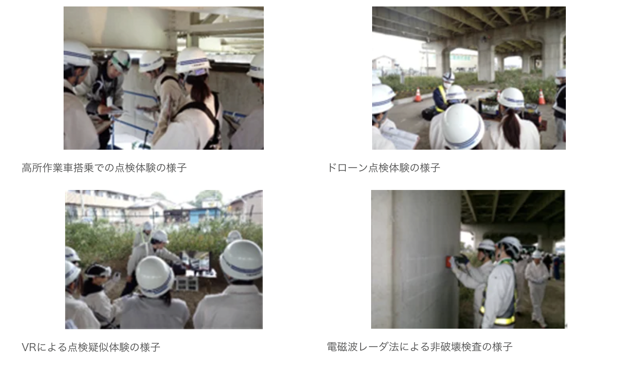 当日は、高所作業車2台を使用した上部工での近接目視点検のほか、各種ドローンを活用した点検支援技術、反発硬度法や電磁波レーダ法による非破壊検査、さらにVRを用いた疑似点検体験など、幅広い内容が実施された。