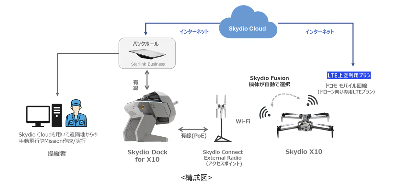 NTTドコモビジネスは、グリッドスカイウェイ有限責任事業組合、関西電力送配電の協力のもと、電力インフラにおけるドローンポート「Skydio Dock for X10」を活用した自動巡視の実証実験に成功したと発表した。