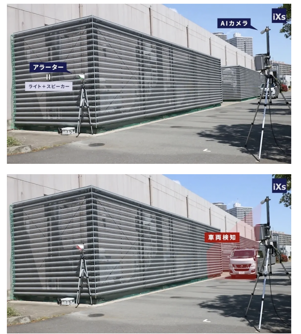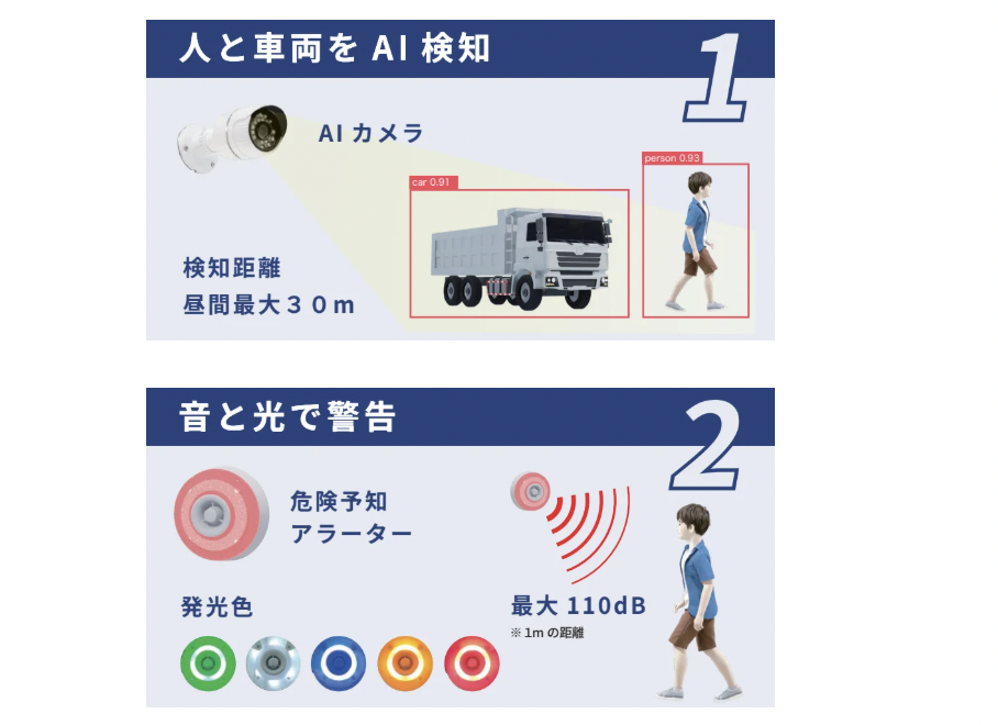 本サービスは、同社が提供するAIカメラとアラーター(ライト+スピーカー)を組み合わせたレンタルサービスで、従来の安全管理に替わり、歩行者・ドライバーの双方への注意喚起や省力化が可能となる。防犯用途としての使用も可能で、NETIS登録済みとなっている。