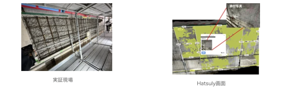 従来は、現地で実測・写真撮影して得た情報から点検報告書を作成していたが、今回現地で3Dデータを取得し、Hatsuly上で対象箇所を選択することで、従来方法と同品質の報告データを生成することができた。