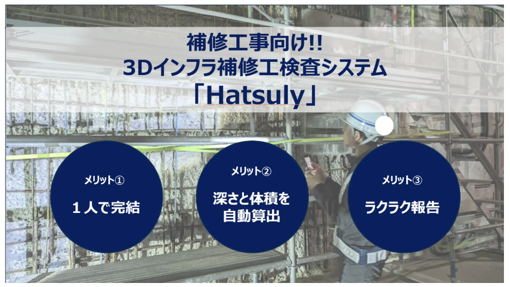 Hatsulyは、道路構造物の補修工事における調査や表面被覆工や剥落防止工の出来形検査、断面修復工における出来形検査など、インフラ補修における検測を効率化するシステムである。