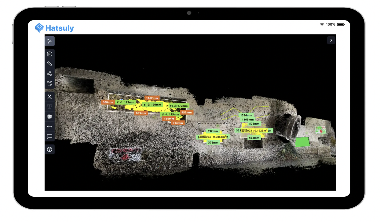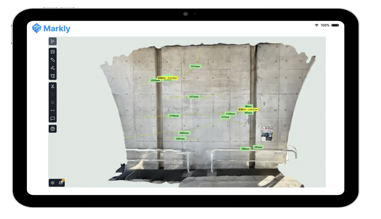Marklyは、3Dデータを用いて、インフラ点検・調査や、補修工事全般における現地踏査後の図面・数量計算書・竣工図等の作成を効率化するシステムだ。