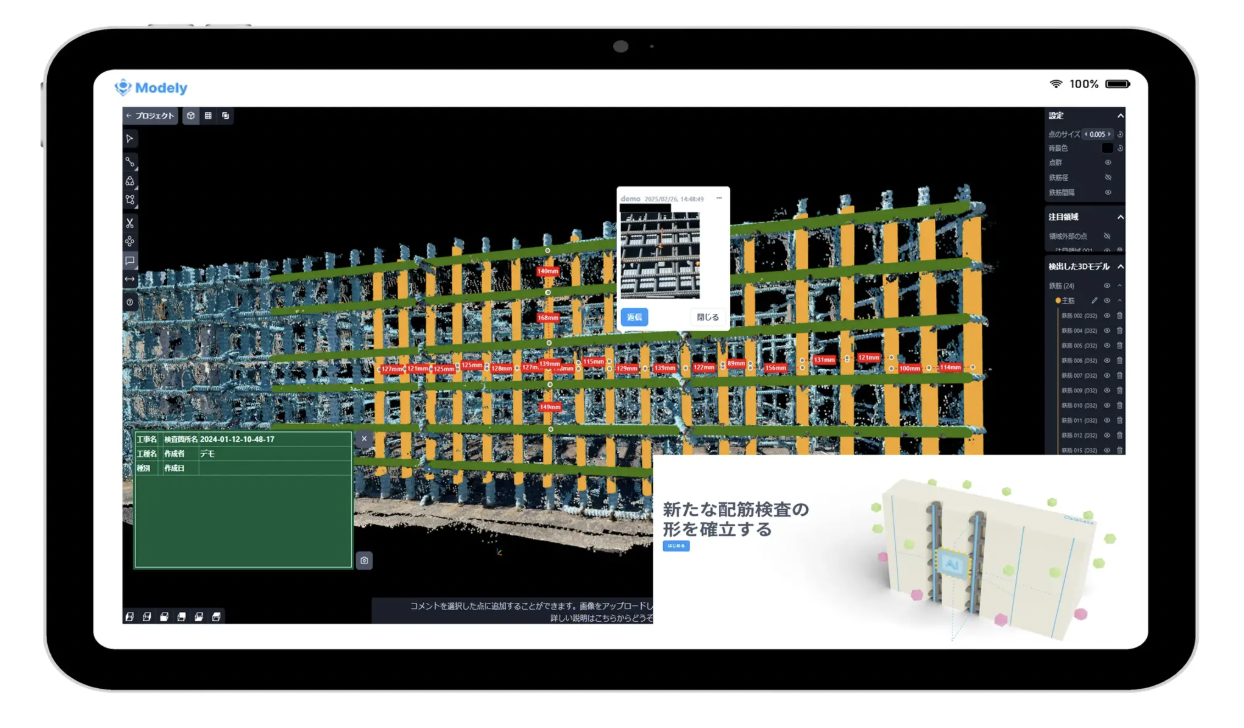 Modelyは、配筋検査をiPad1台で撮影・自動判定・帳票作成まで行えるクラウド型システムである。