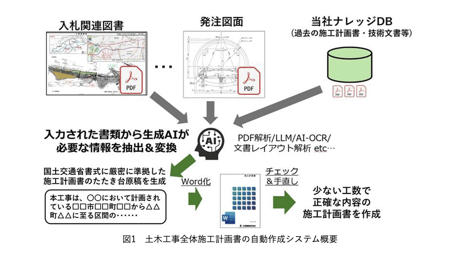大成建設は、最新の生成AIを活用して土木工事における「全体施工計画書」の作成を支援するシステムを開発したと発表した。
