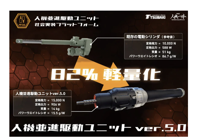 人機一体は椿本チエインと共同で、建設機械の油圧シリンダを代替可能な高耐衝撃性電動シリンダ「人機並進駆動ユニット ver.6.0」を開発したと発表した。