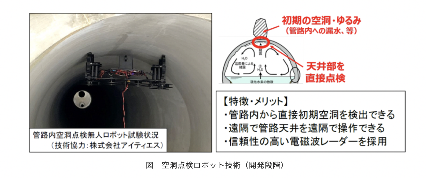二つ目の「空洞点検ロボット技術」は、無人で管路内を走行し、電磁波レーダーを用いて管路の外側に発生した初期段階の空洞を検知するものである。