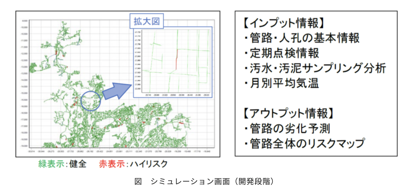 従来の手法では困難だった硫化水素の生成プロセスや管内温度などを考慮した国際的なモデル(WATSモデル)を用い、微生物による管路の劣化をシミュレーションする。