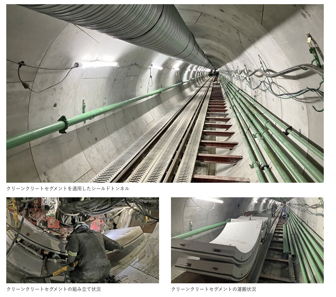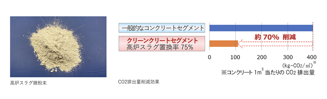 「クリーンクリートセグメント」はこの技術をシールドトンネル用セグメントに応用したもので、セメントの約75%を高炉スラグ微粉末に置き換えた場合、製造時のCO2排出量を従来のセグメントと比較して約70%削減することが可能だ。