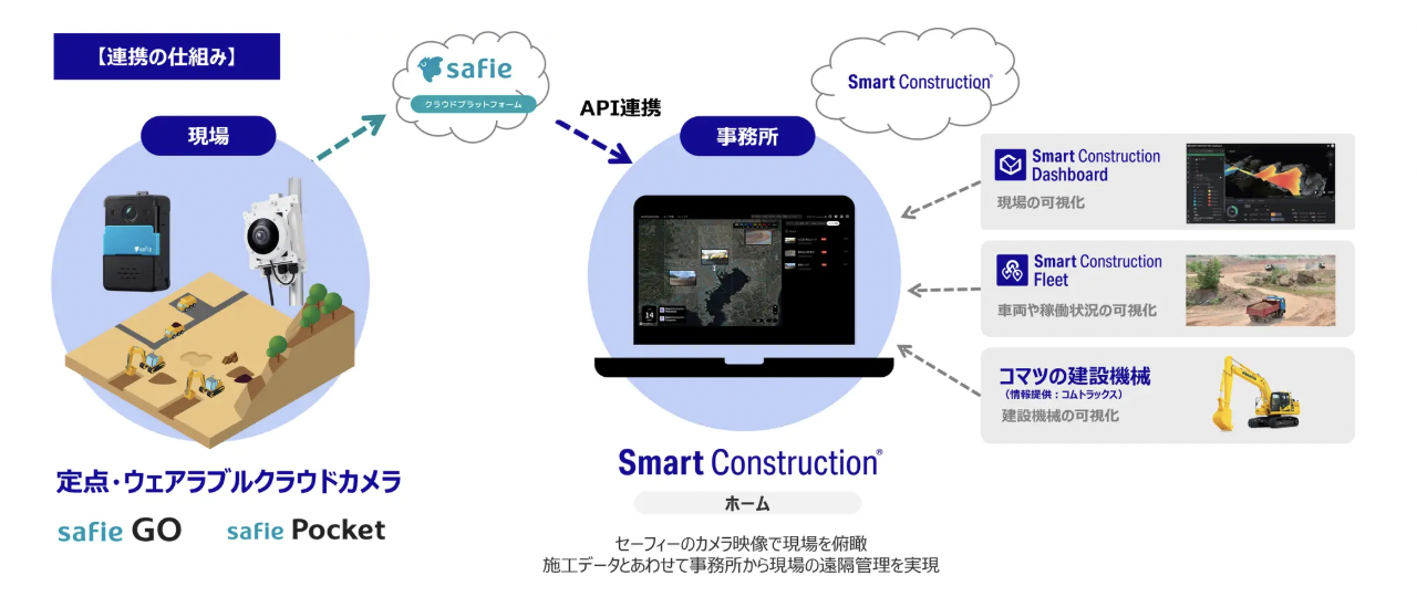 具体的には、EARTHBRAINが提供する「Smart Construction®」のクラウドプラットフォーム上に、セーフィーのクラウドカメラ「Safie GO」やウェアラブルカメラ「Safie Pocket」のリアルタイム映像が表示されるようになる。