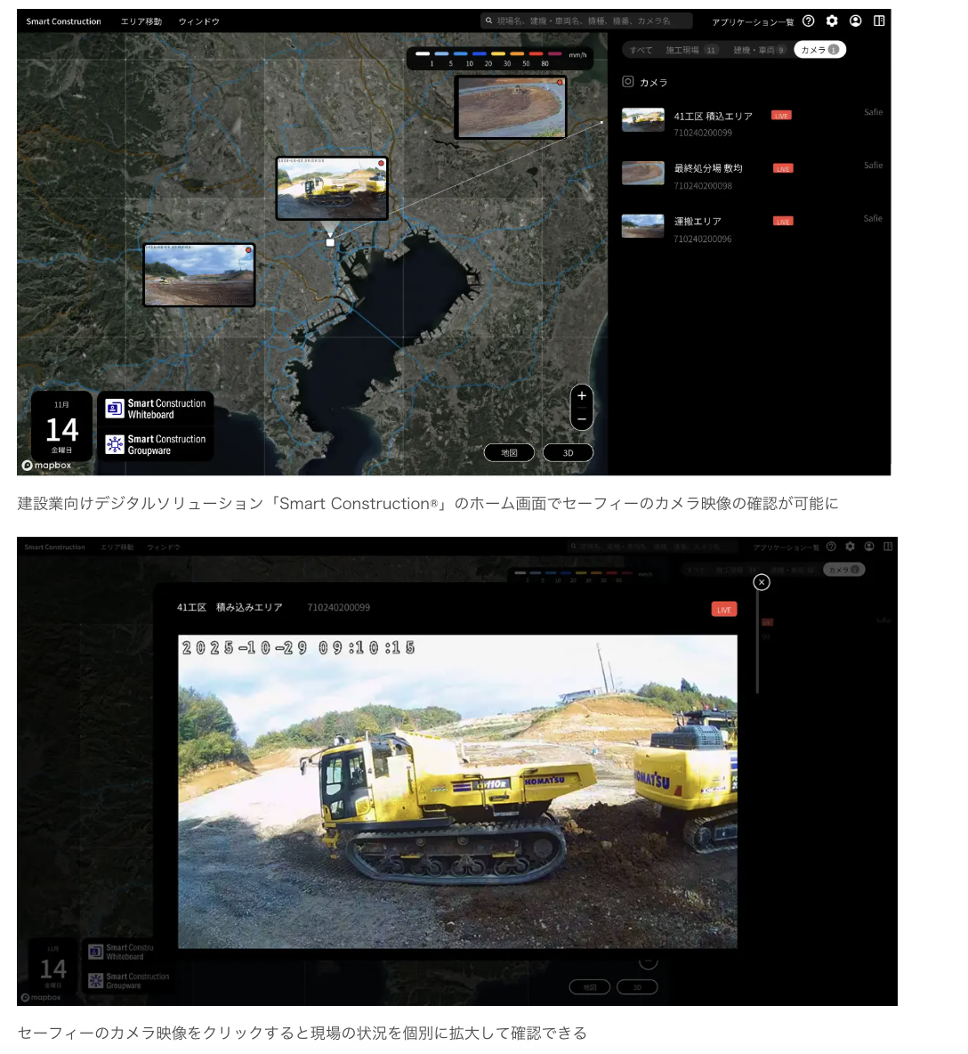 「Smart Construction®」のホーム画面にある地図情報上で、建設機械の位置情報とカメラのライブ映像を同時に確認できるため、管理者は現場全体の状況を俯瞰的に把握することが可能だ。