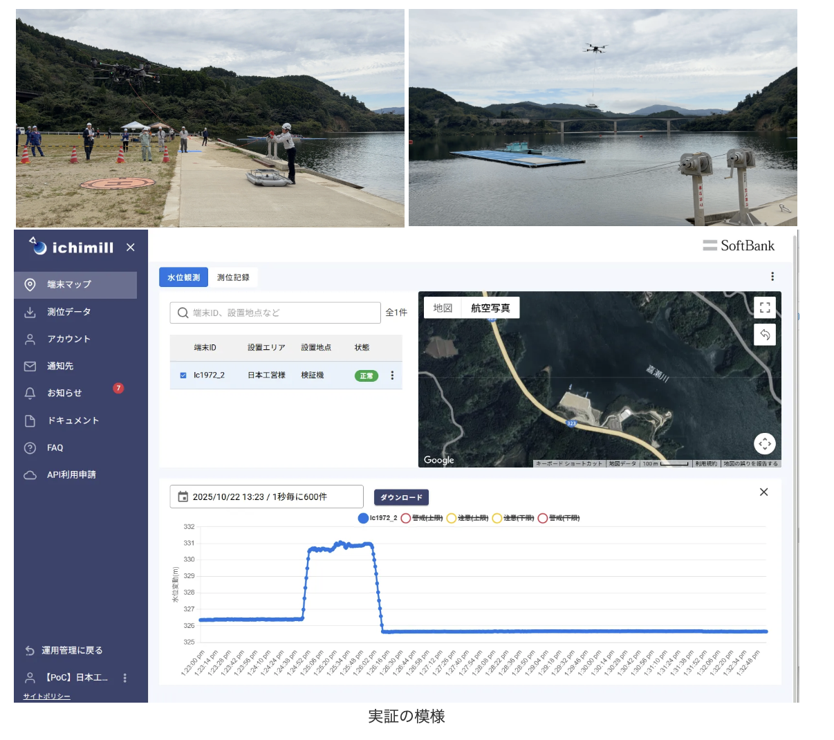 ソフトバンクは、佐賀県の嘉瀬川ダムにおいて、高精度測位サービス「ichimill(イチミル)」とドローンを活用した水位計測の実証実験を行ったと発表した。