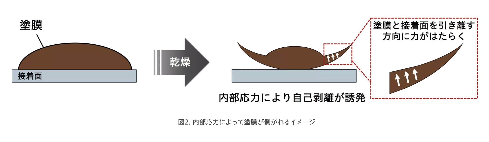 - 乾燥・収縮: 乾燥が進むにつれ、塗膜内部に縮もうとする力が発生する。