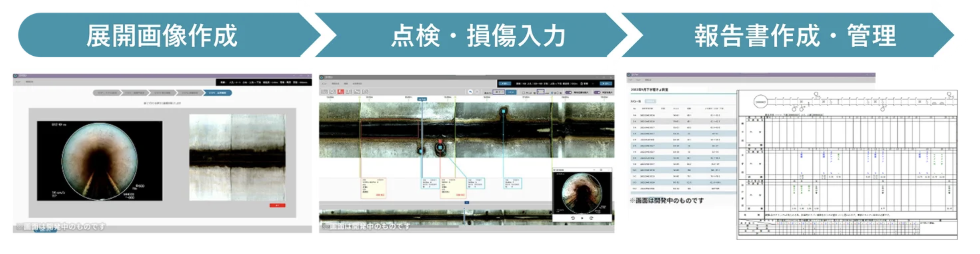 「スマカン」は、管内カメラの動画を展開画像に変換し、点検結果の入力から報告書作成までを一貫して行えるソフトウェアである。