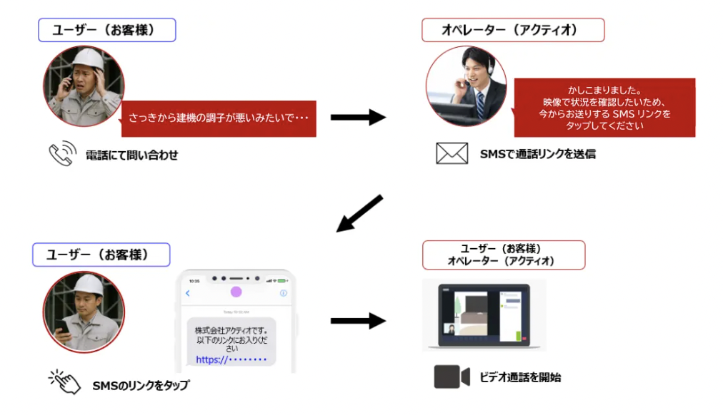 サポート担当者がSMS(ショートメッセージサービス)でURLを送信し、現場の利用者がそれをタップするだけで、ブラウザ経由でのビデオ通話が開始される。スマートフォンに不慣れな作業員でも簡単に利用できる。