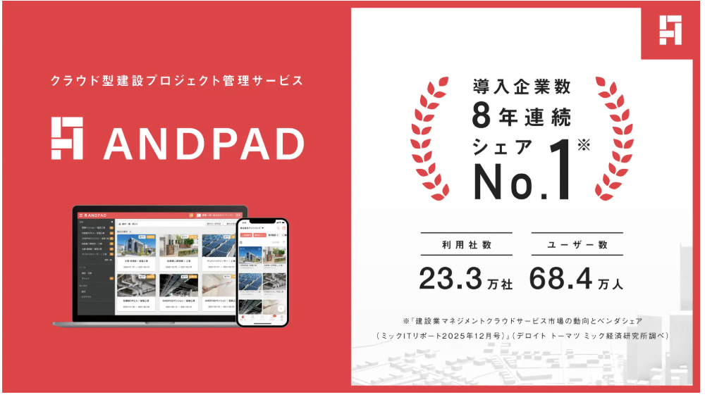 アンドパッドは12月18日、同社が提供するクラウド型建設プロジェクト管理サービス「ANDPAD」が、デロイト トーマツ ミック経済研究所の調査において、「建設業マネジメントクラウドサービス市場」の導入企業数で8年連続シェアNo.1を獲得したと発表した。