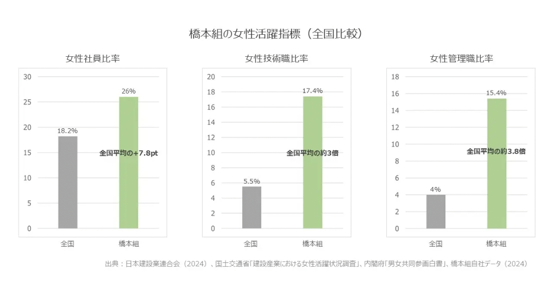 建設業界では長時間労働や現場勤務の多さからハードルが高いとされる中、同社は社員の女性比率26%、女性管理職比率15.4%を実現している。