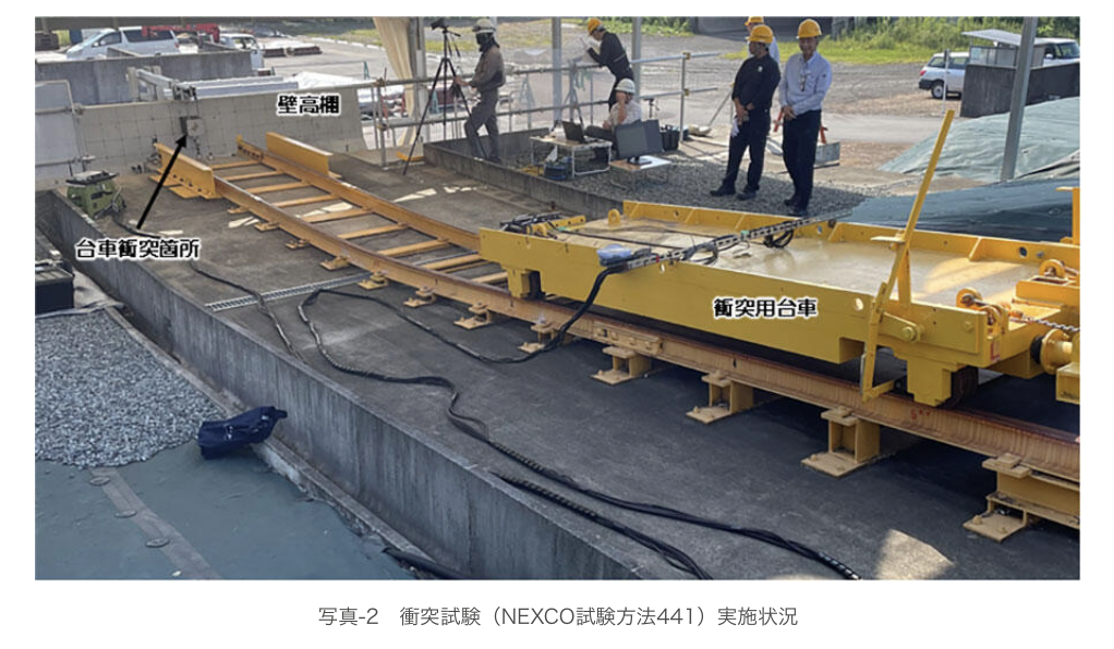 開発にあたり、NEXCOの試験法に基づき実車衝突相当の衝撃荷重試験を実施。壁高欄の端部、中央部、接合部のすべてにおいて所定の性能を満たすことを確認した。