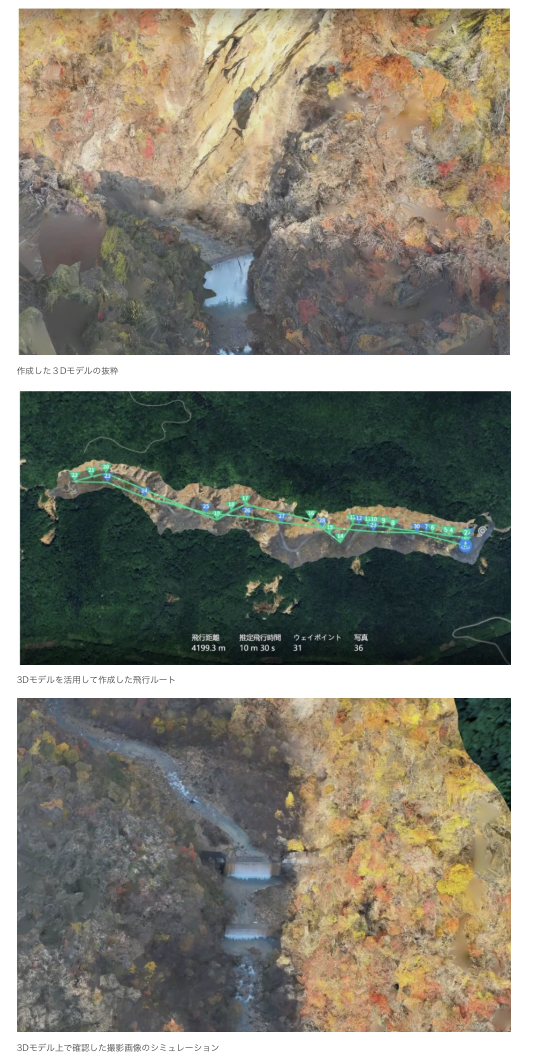 また、初回飛行時に現地の3Dモデルを作成し、それに基づいて飛行ルートや撮影ポイントを精密に設計する手法を採用した。