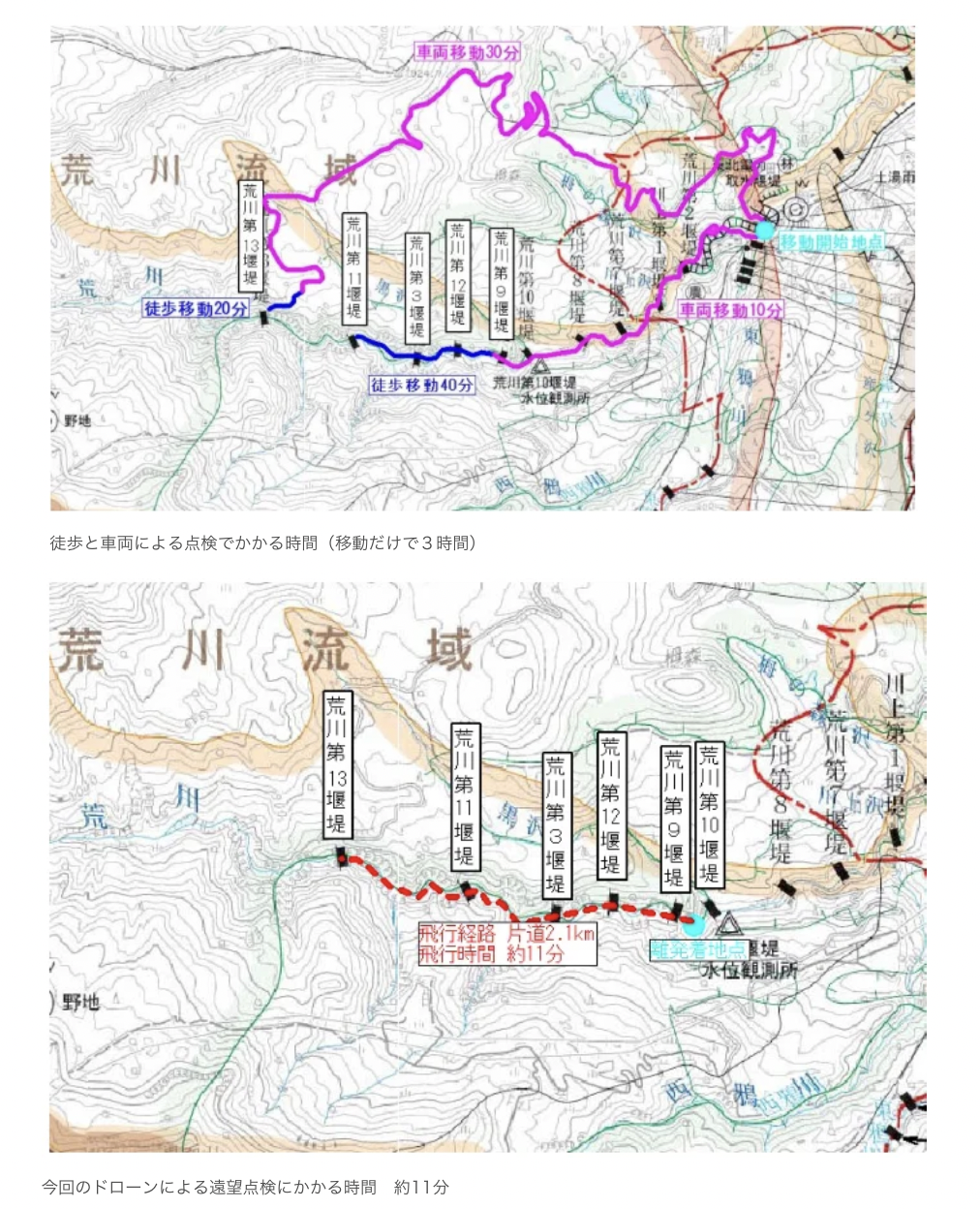 これにより、従来は移動だけで約3時間かかっていた点検作業を、ドローン飛行約11分で完了できることを実証した。