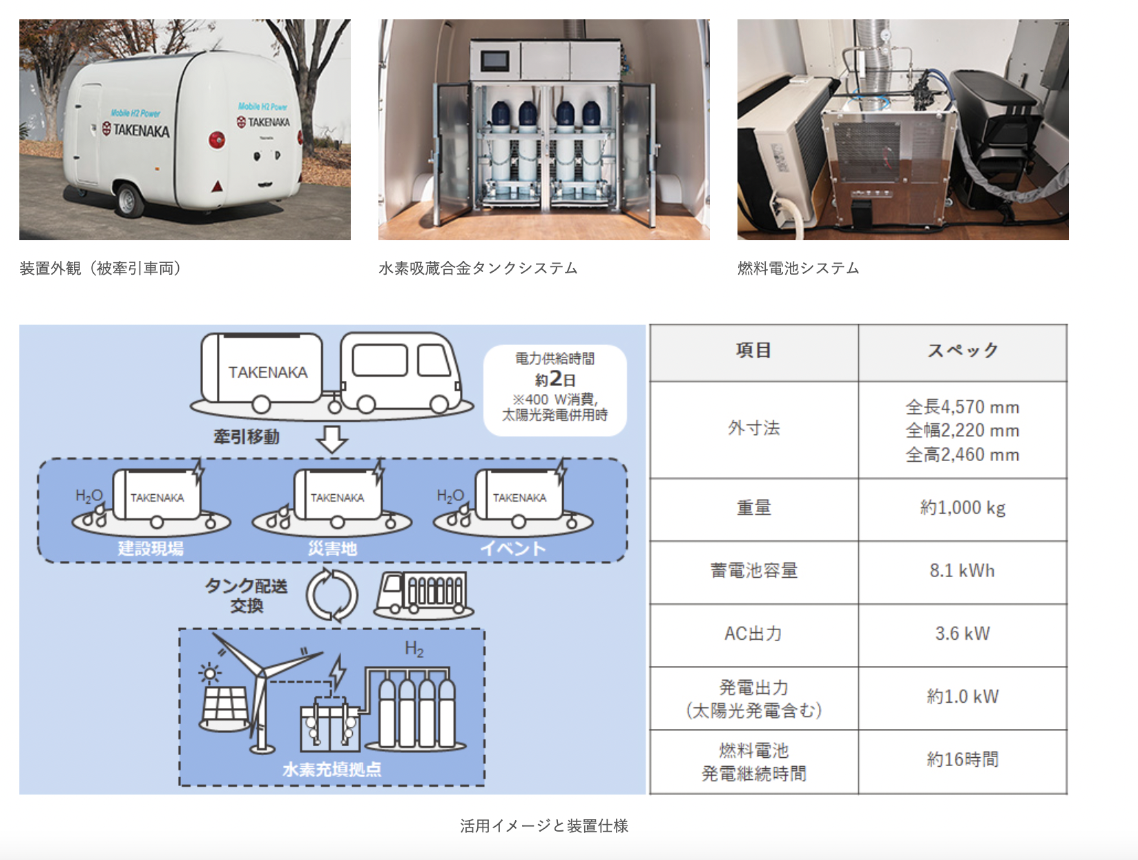 今回開発された装置は、竹中工務店と那須電機鉄工が開発した「小型軽量水素吸蔵合金タンク」と、日本フイルコンの「燃料電池システム」を組み合わせ、被牽引車両(トレーラー)に搭載したものだ。
