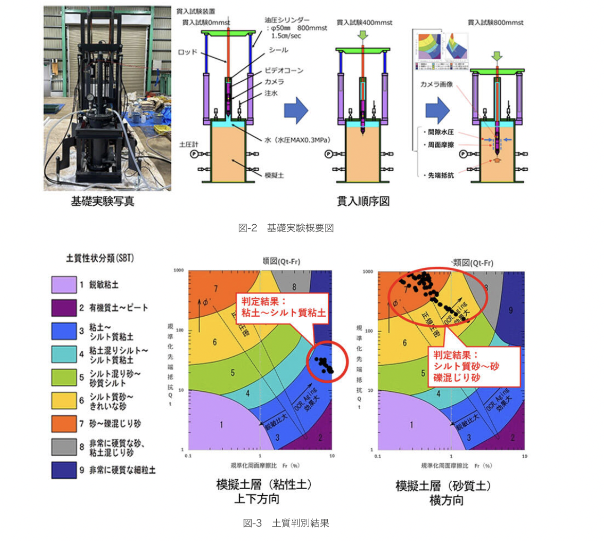 地盤調査で用いられる試験機にカメラを搭載した「ビデオコーン」をシールド機に実装することで、数値データと映像の両面から高精度な土質判別や空隙探査を可能にする。