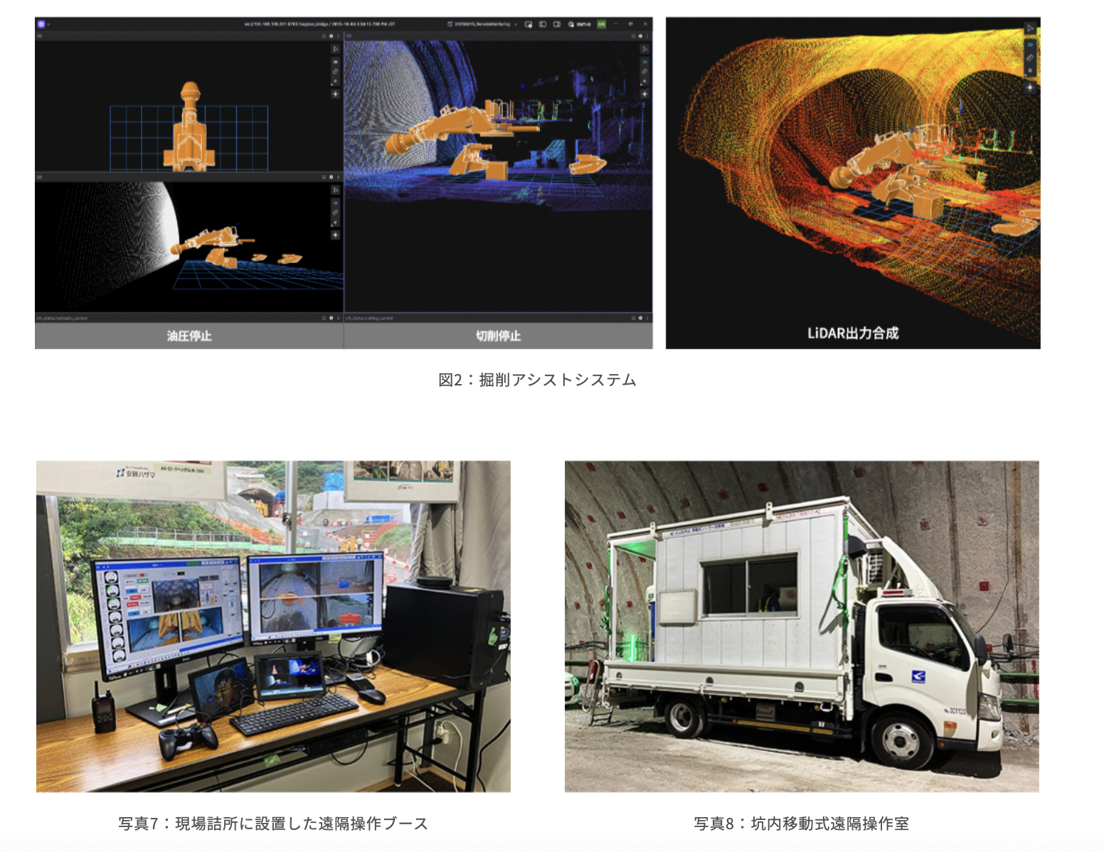 - 遠隔操作機能: 遠隔室のモニターや「掘削アシストシステム」の改良により、LiDARで取得した周辺データを重ね合わせて表示するなど、状況把握がより容易になった。トラブル時のアラート機能も強化されている。