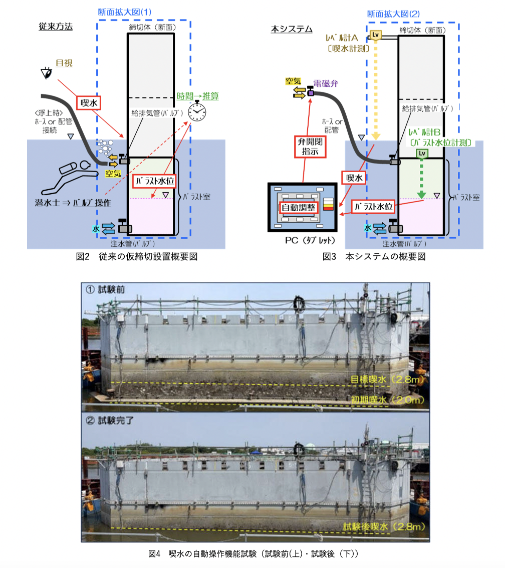 本システムは、岡山県岡山市の「児島湾締切堤防排水樋門改修工事」で実証導入され、姿勢制御および沈降・浮上作業の自動化に成功している。