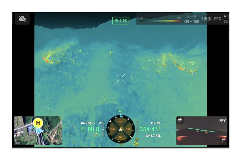 (赤外線カメラにより可視化された火点)これらの情報は、翌日に行われた自衛隊や消防ヘリによる消火活動において、的確な散水ポイント(火点)や延焼状況を把握するための重要な参考情報として提供された。