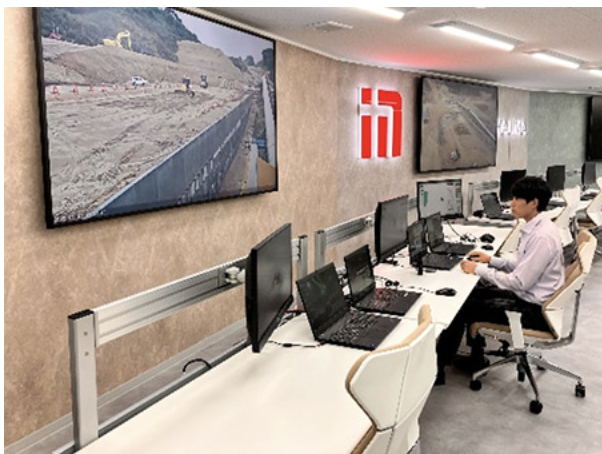 本工事では、現場から約2km離れた工事事務所に設置されたオペレーションルームから、1人の管制員が自動ブルドーザ1台と自動振動ローラ1台の計2台を管制する。