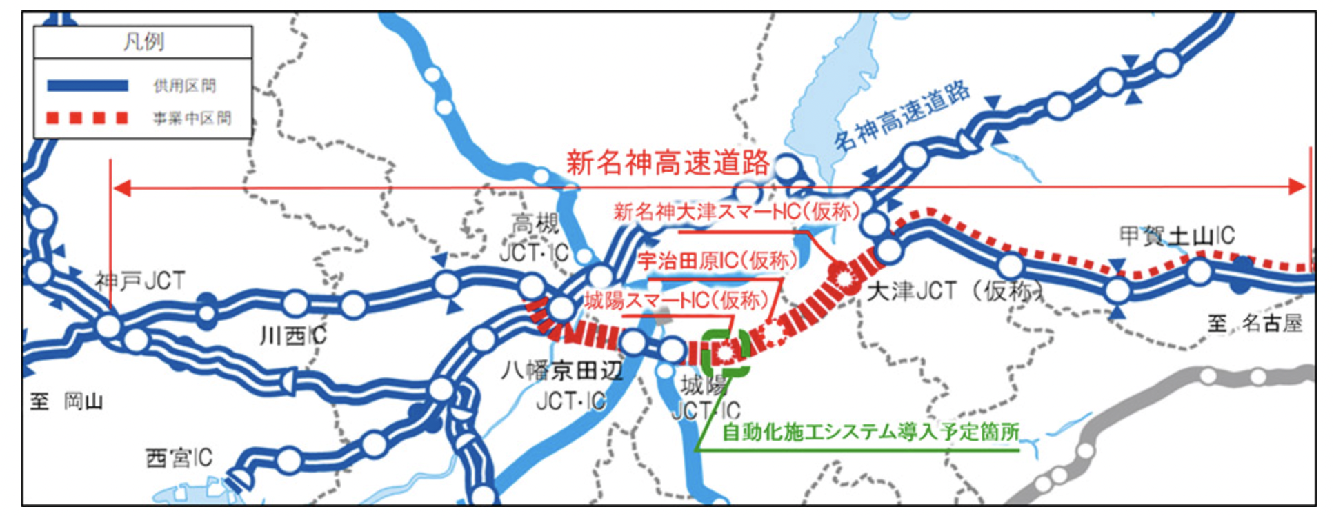 西日本高速道路(NEXCO西日本)と鹿島建設は2026年1月28日、京都府城陽市で建設中のE1A新名神高速道路(大津JCT~城陽JCT・IC間)において、鹿島が開発した自動化施工システム「A⁴CSEL(クワッドアクセル)」を導入し、自動ブルドーザと自動振動ローラによる施工を本格的に開始したと発表した。