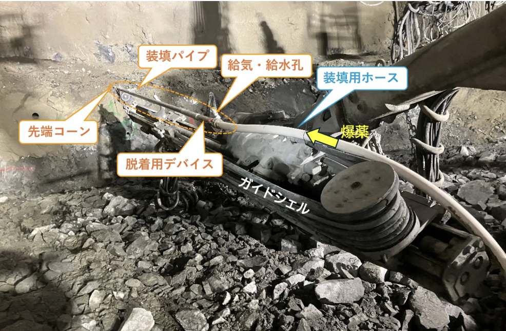山岳トンネル工事では、ドリルで空けた穴(装薬孔)に爆薬を詰める作業はこれまで人力で行われており、常に落石の危険と隣り合わせだった。